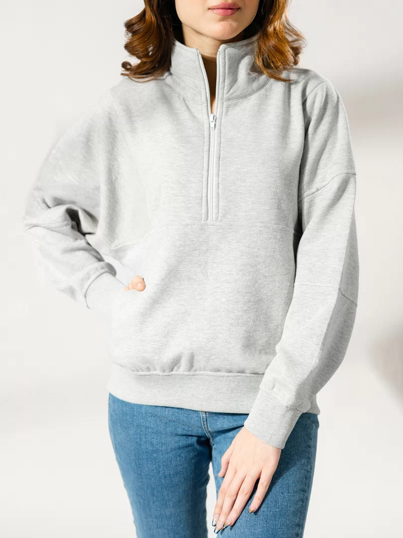 Stay comfortable and stylish in Kai's American oversized sweatshirt. Crafted with a relaxed fit, it's designed with intricate sewing details and a quarter zip neck with a standing collar. Features back and arm panels and front pockets. Suitable for any activity, the ribbed bottom and sleeves add a touch of texture and style. Stay warm and look cool!